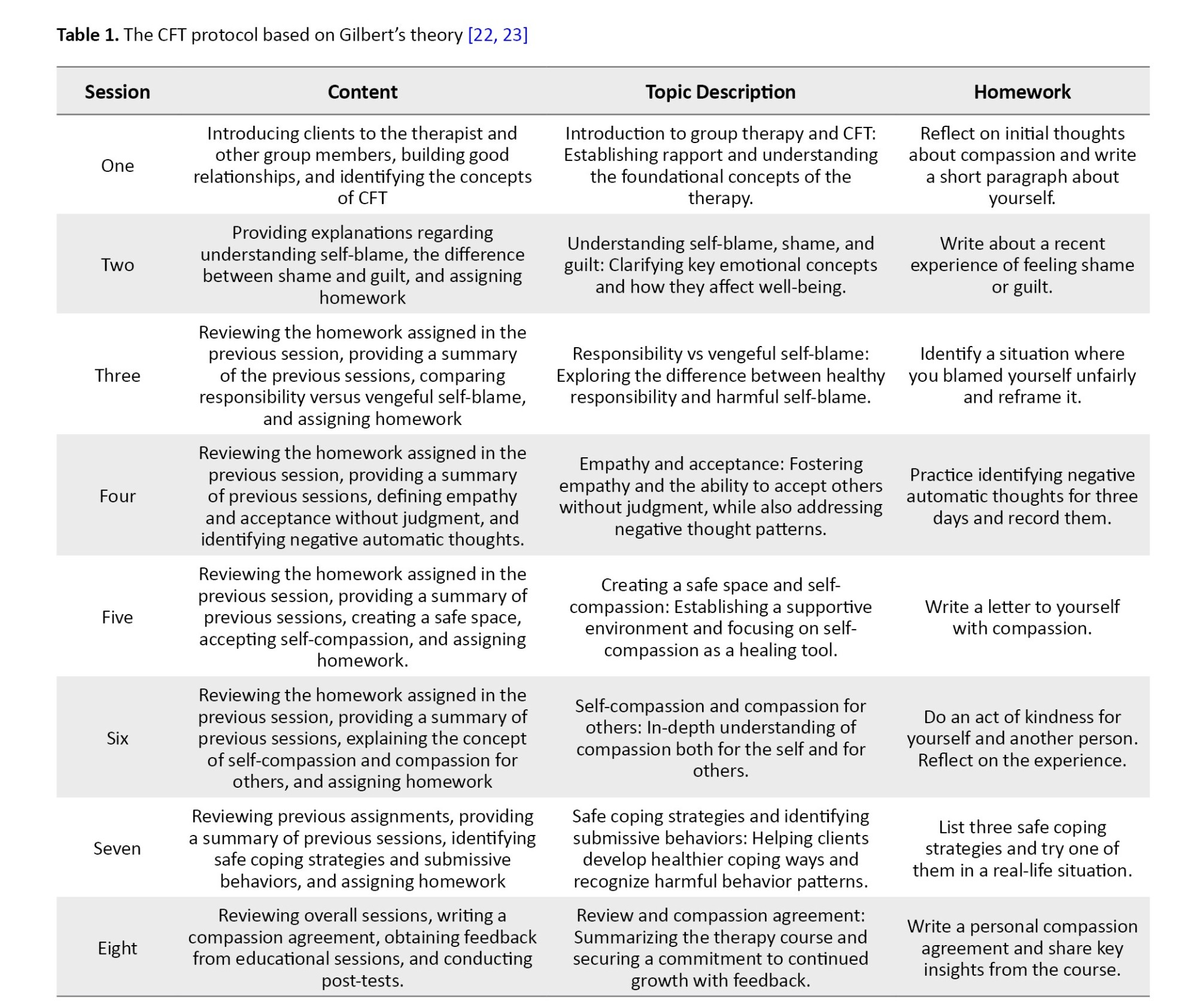 The intervention was provided based on Gilbert’s CFT protocol [22, 23], which emphasizes developing self-compassion, reducing self-criticism, and enhancing emotional regulation through structured therapeutic techniques. The program was delivered at eight weekly sessions, each with specific objectives such as introducing CFT concepts, addressing self-blame and shame, fostering empathy, creating a safe emotional space, and building strategies for coping and self-care. A detailed summary of the sessions is presented in Table 1.