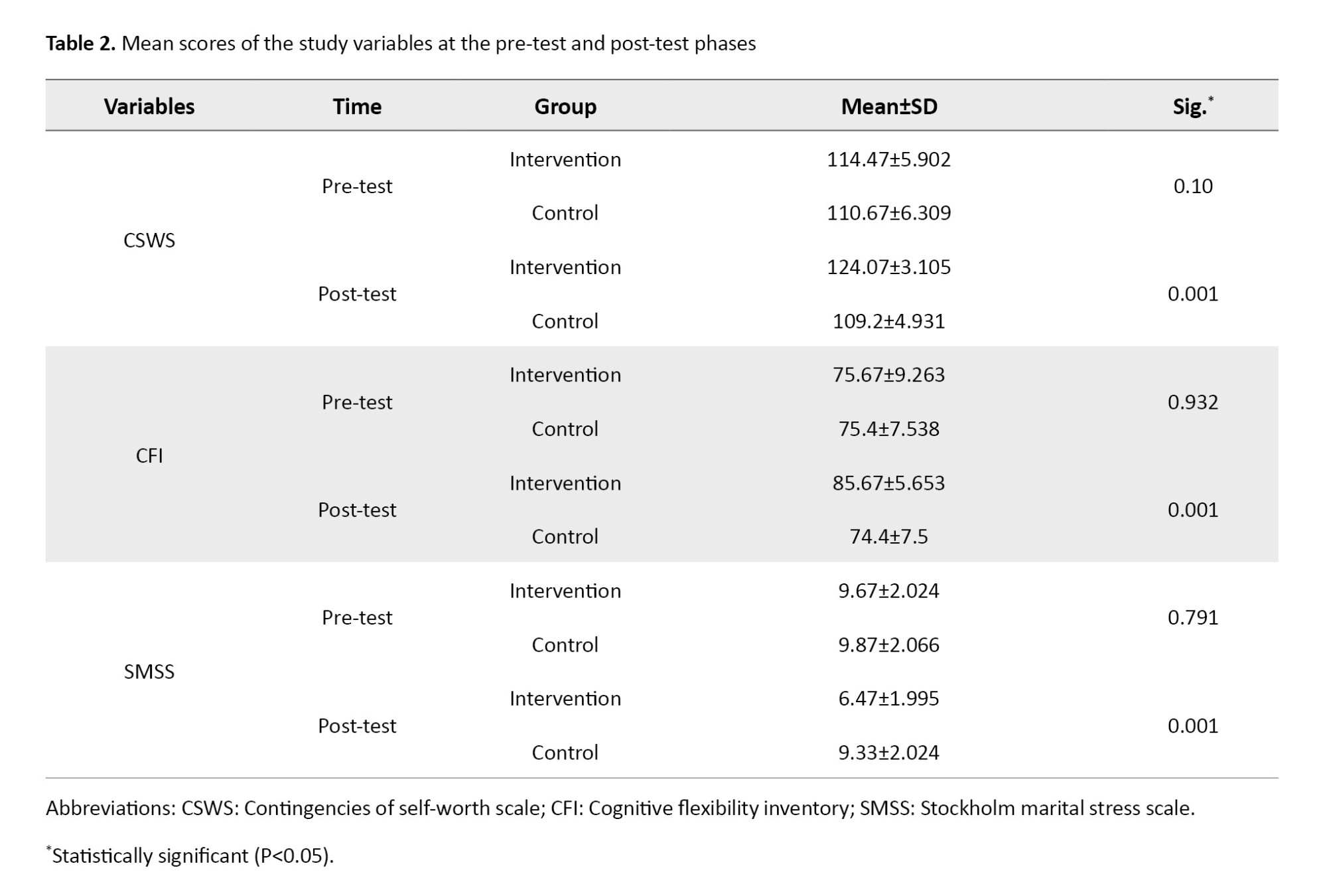 It has a concurrent validity of -0.39 with the Beck depression inventory and a convergent validity of 0.75 with Martin and Rubin’s cognitive flexibility scale. For the Persian version, a test re-test reliability of 0.71 and a Cronbach’s α value of 0.90 for the entire scale have been reported [27, 28]. The Stockholm marital stress scale (SMSS), developed by Orth-Gomér et al. [29], was used to measure marital stress. It consists of 17 items scored by 0 or 1, with higher scores indicating higher marital stress. It has a Cronbach’s α value of 0.77 and satisfactory construct validity. The Persian version of this scale was validated by Noroozi et al. [30]. After collecting data before and after the intervention, they were analyzed using descriptive and inferential tests in SPSS software, version 26.