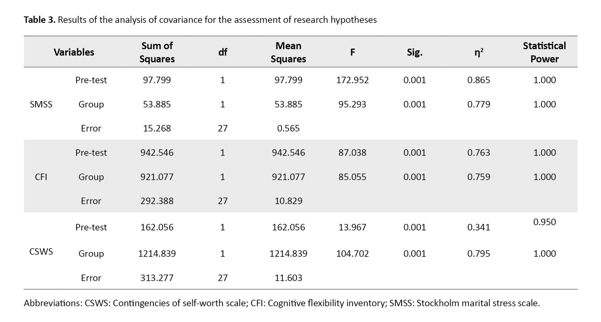 To examine the statistical significance of this difference, the analysis of covariance test was used. The results are presented in Table 3. As shown in the table, considering the pre-test as a covariate, there was a significant difference (P<0.05). The CFT had an effect size of 78% on marital stress, 76% on cognitive flexibility, and 79% on self-value in the intervention group. A test power of 0.95 indicates that the sample size was adequate. Therefore, the research hypotheses are confirmed, and it can be stated that CFT had a significant impact on marital stress, cognitive flexibility, and self-worth in female healthcare workers.