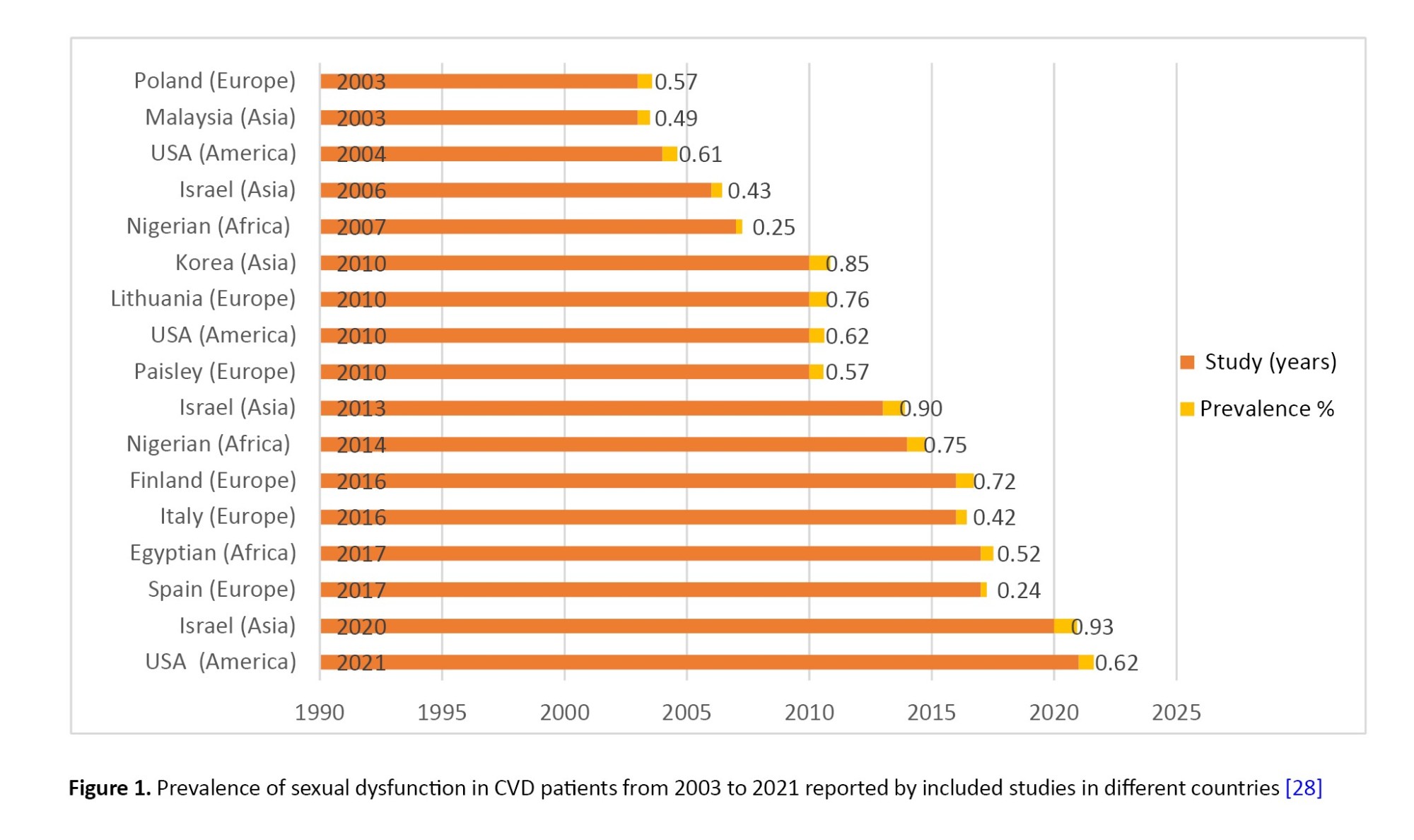 Cardiovascular diseases (CVDs), one of the leading causes of death, contribute to one-third of deaths globally [1]. In developing countries, the rate reaches 50% [2]. CVDs include ischemic heart disease, coronary heart disease, peripheral arterial disease, chronic hypertension, myocardial infarction, heart failure, and more cardiovascular conditions [3]. The CVD incidence increases for reasons such as having an unhealthy diet, smoking, having low or no physical activity, and exposure to excessive stress [4]. CVDs cause psychological and physical harms that reduce the patient’s quality of life (QoL) [1]. They can also cause sexual dysfunction, physically and mentally [5]. Patients with CVD have reported that their impaired sexual function has negatively affected their overall QoL [6]. Studies indicate that the prevalence of sexual dysfunction among CVD patients can be as high as 89% [2], which is three times greater than that observed in individuals without CVD [5]. Sexual dysfunction refers to difficulties in engaging in a satisfactory sexual activity among couples. Examples of sexual dysfunction include libido disorders, male erectile dysfunction (ED), female sexual arousal disorder, premature ejaculation, orgasm disorders in both males and females, and sexual pain conditions such as vaginismus and dyspareunia [6, 7]. The European Society of Urology defines ED as a persistent inability to attain and maintain an adequate erection for satisfactory sexual activity [6]. Patients with CVD often report symptoms of sexual dysfunction, which include a decrease in sexual desire, a tendency to avoid sexual activities, and feelings of sexual dissatisfaction [1]. Sexual dysfunction in patients with CVDs may result from physical, psychological, and medication-related factors [1, 2]. The physical and psychological effects of CVDs have proven to interfere with sexual activity, causing a reduction in patient QoL that comes from reduced self-esteem, depression, and isolation [8, 9]. Sexual dysfunction may predict CVD before other symptoms such as a cardiovascular event [10]. Patients with CVDs have sleep disorders 3-5 years prior to the emergence of other clinical signs of CVD. This timeframe may be leveraged in the future to implement therapeutic interventions aimed at addressing CVD risk factors at an earlier stage [8]. Epidemiological research indicates that both sexual dysfunction and CVDs are highly prevalent worldwide [1].