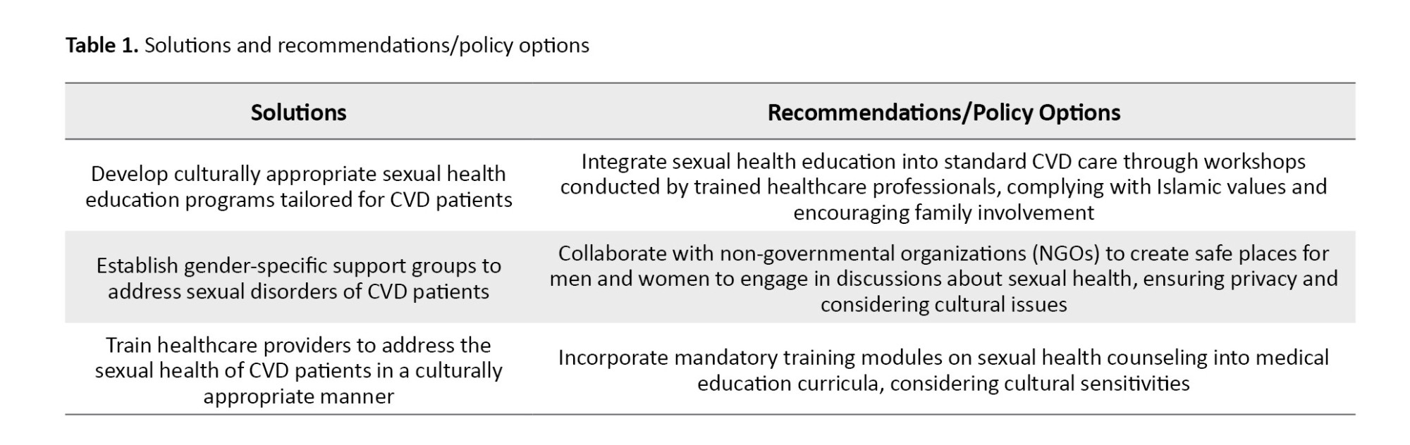 This policy brief outlines a series of solutions aimed at addressing sexual disorders among CVD patients in Iran. Proposed solutions include culturally appropriate educational programs, training for healthcare providers, and the establishment of gender-specific support groups and mobile clinics. These solutions can mitigate cultural barriers, such as stigma and limited access to healthcare in rural areas, while prioritizing health equity and cultural acceptability. Although these solutions are backed by substantial evidence, their successful implementation depends on multi-sectoral collaboration and a phased approach to effectively navigate logistical challenges and cultural conservatism.