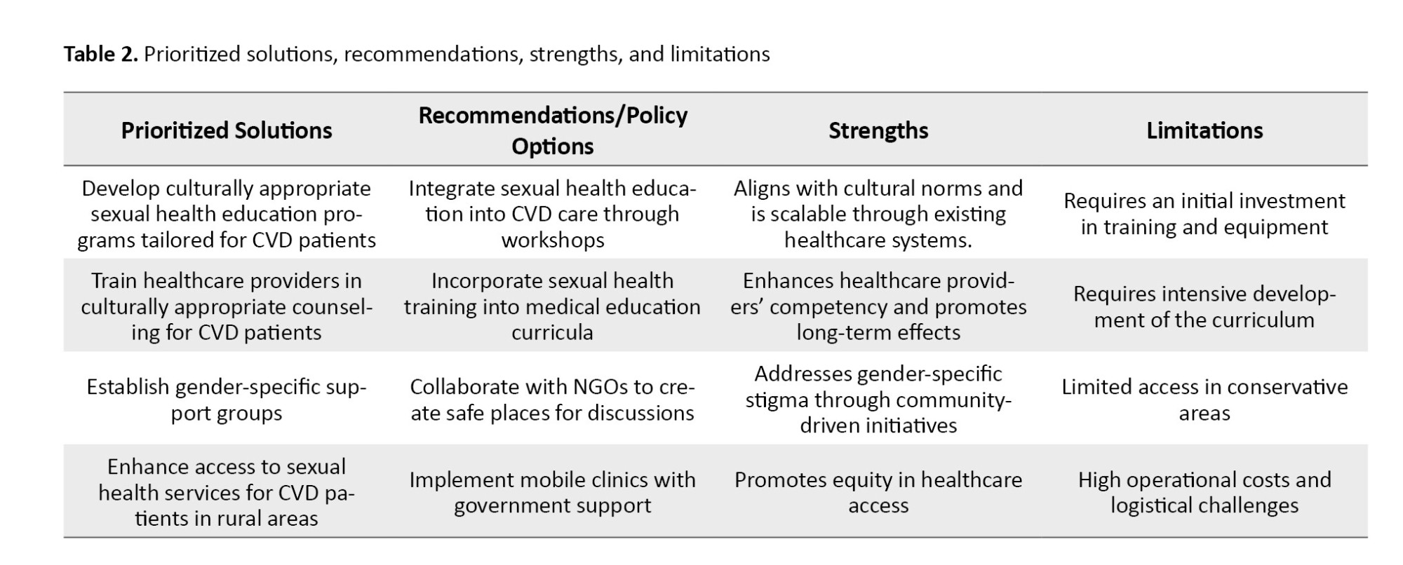 Cardiologists should be aware of the adverse effects of cardiac medications on sexual health. Knowing the side effects of prescribed medications on sexual function allows healthcare providers to take proactive measures to enhance patient health and QoL. Patients need to be adequately informed about the potential side effects of their prescribed medications, enabling them to make informed decisions regarding their treatment. Table 1 outlines the proposed solutions for enhancing sexual health in CVD patients based on the Iranian culture, accompanied by relevant recommendations and policy options.