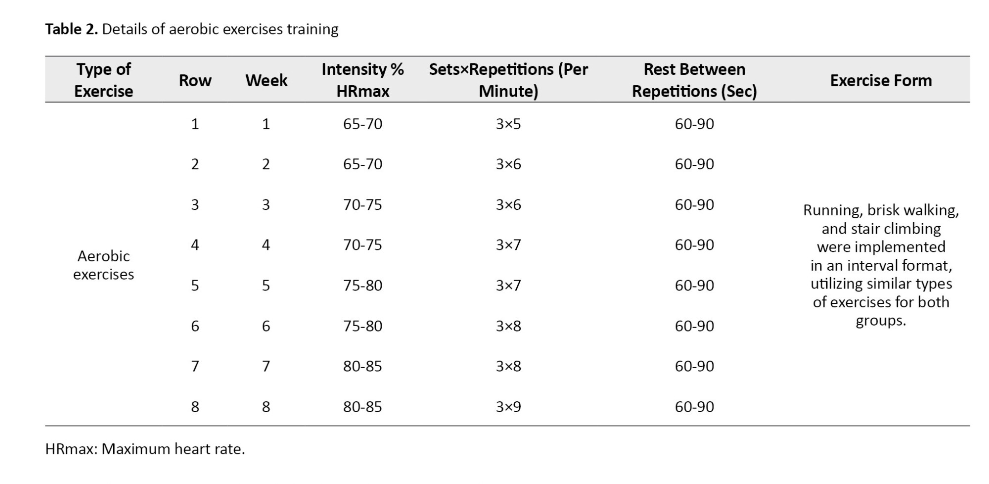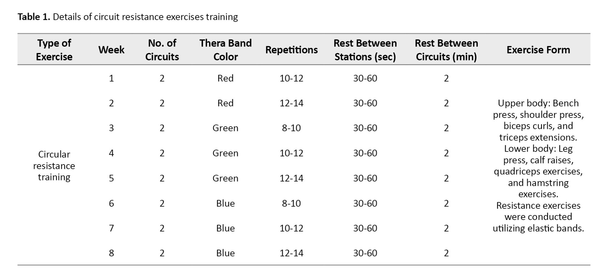 The training program for the exercise groups consisted of three sessions per week for eight weeks (Tables 1 and 2). The elastic bands included colors, such as yellow (light), red (medium), green (heavy), blue (very heavy), black (special heavy), silver (very heavy), and gold (maximum) [17]. Considering the physiological reduction in muscular strength in the elderly and the physical capabilities of the participants, only three colors—red (medium), green (heavy), and blue (very heavy)—were used.