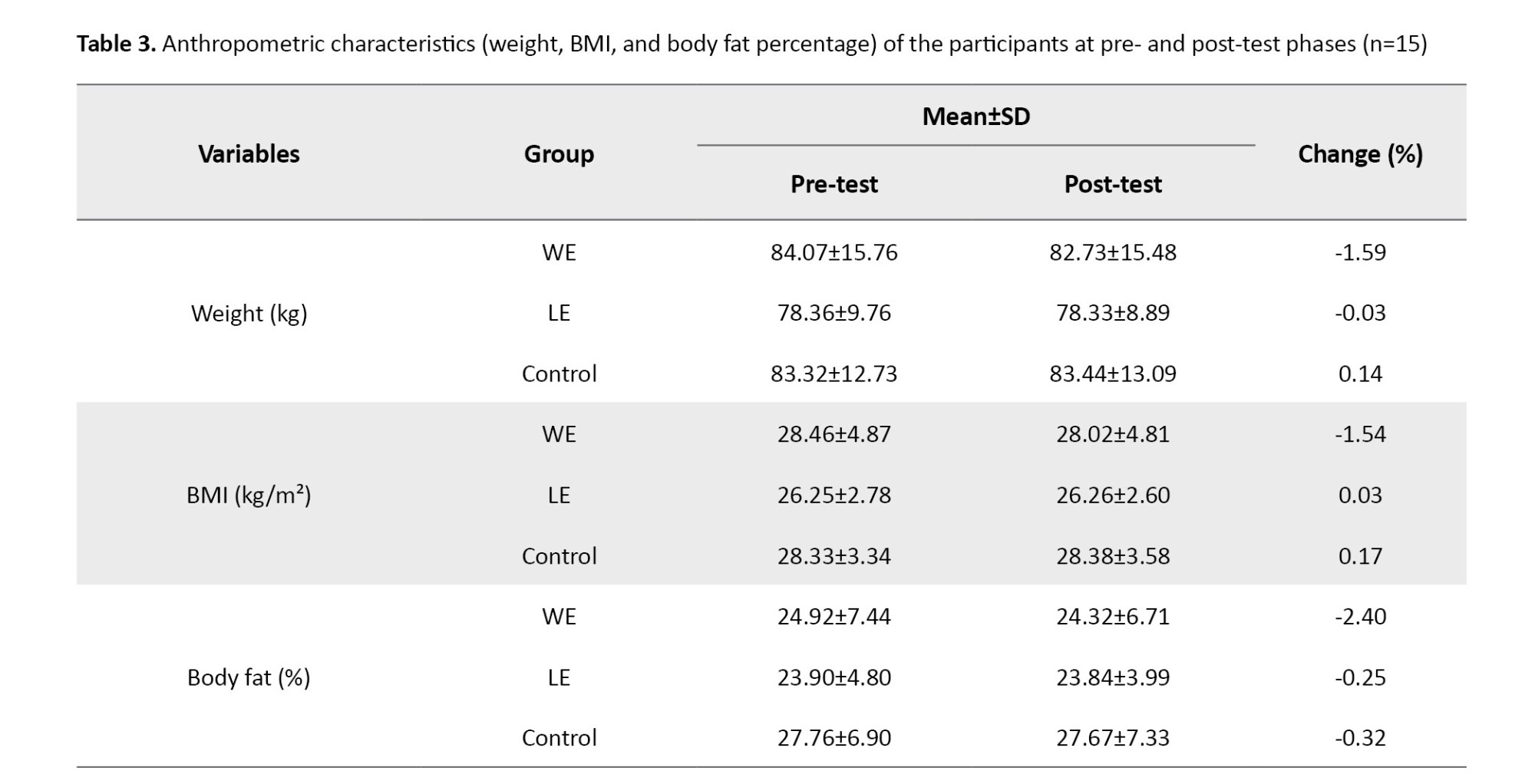 The results of the descriptive statistics concerning the anthropometric characteristics are presented in Table 3. The percentage changes indicated a decrease in weight and body fat percentage in both exercise groups, as well as a decrease in BMI in the aquatic exercise group.