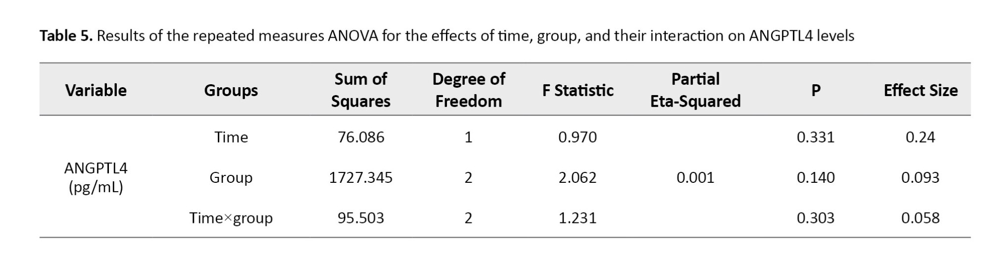 Based on the results presented in Table 5, it is evident that the interaction effect of time within the group for the ANGPTL4 variable (P=0.303) was not statistically significant. This finding suggests that there were no meaningful changes among the three groups examined.