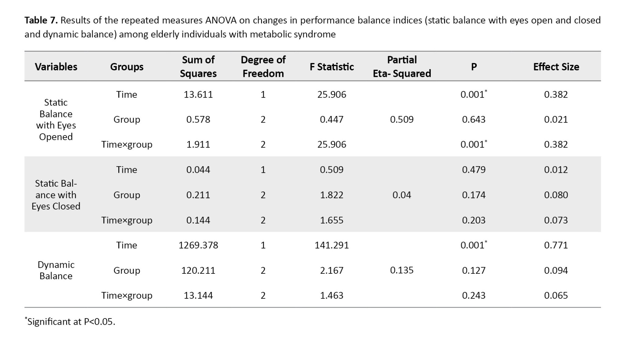 Intra-group mean comparisons indicated that both dynamic balance and static balance with eyes open exhibited significant improvements in all three groups when compared to pre-test measurements (P<0.05) (Figure 1). However, the results of the post-hoc did not reveal significant differences between the groups at the two time points measured, both prior to and following the intervention; it appears that the timing of the observed changes diverged from the post-test assessment. Furthermore, no significant differences were noted between the groups concerning the other indices (P>0.05).