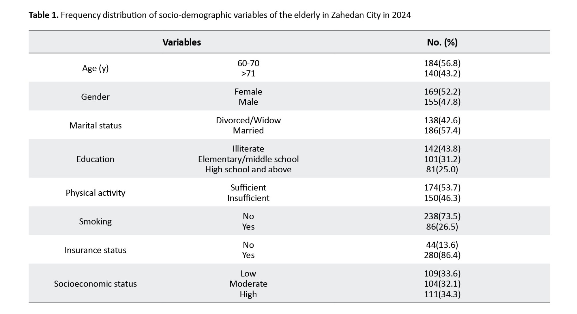 The mean age of the participants in this study was 70.84±18.8 with an age range of 60 to 99 years. In terms of age frequency distribution, 184 participants (56.8%) were between 60 and 70 years, and 140(43.2%) were 71 years and older. Also, 169 participants (52.2%) were female. In terms of marital status, 186 cases (57.4%) were married, and the rest of the older adults were widowed or divorced. In terms of education level, 142 cases (43.8%) were illiterate, 101(31.2%) had completed elementary and middle school, while the others were in high school or above. Regarding physical activity, 174 subjects (53.7%) were physically active. Also, in terms of smoking, 238 subjects (73.5%) did not smoke, and regarding insurance coverage, 280 subjects (86.4%) had insurance. Furthermore, 111 participants (34.3%) belonged to the high socioeconomic status category (Table 1).
