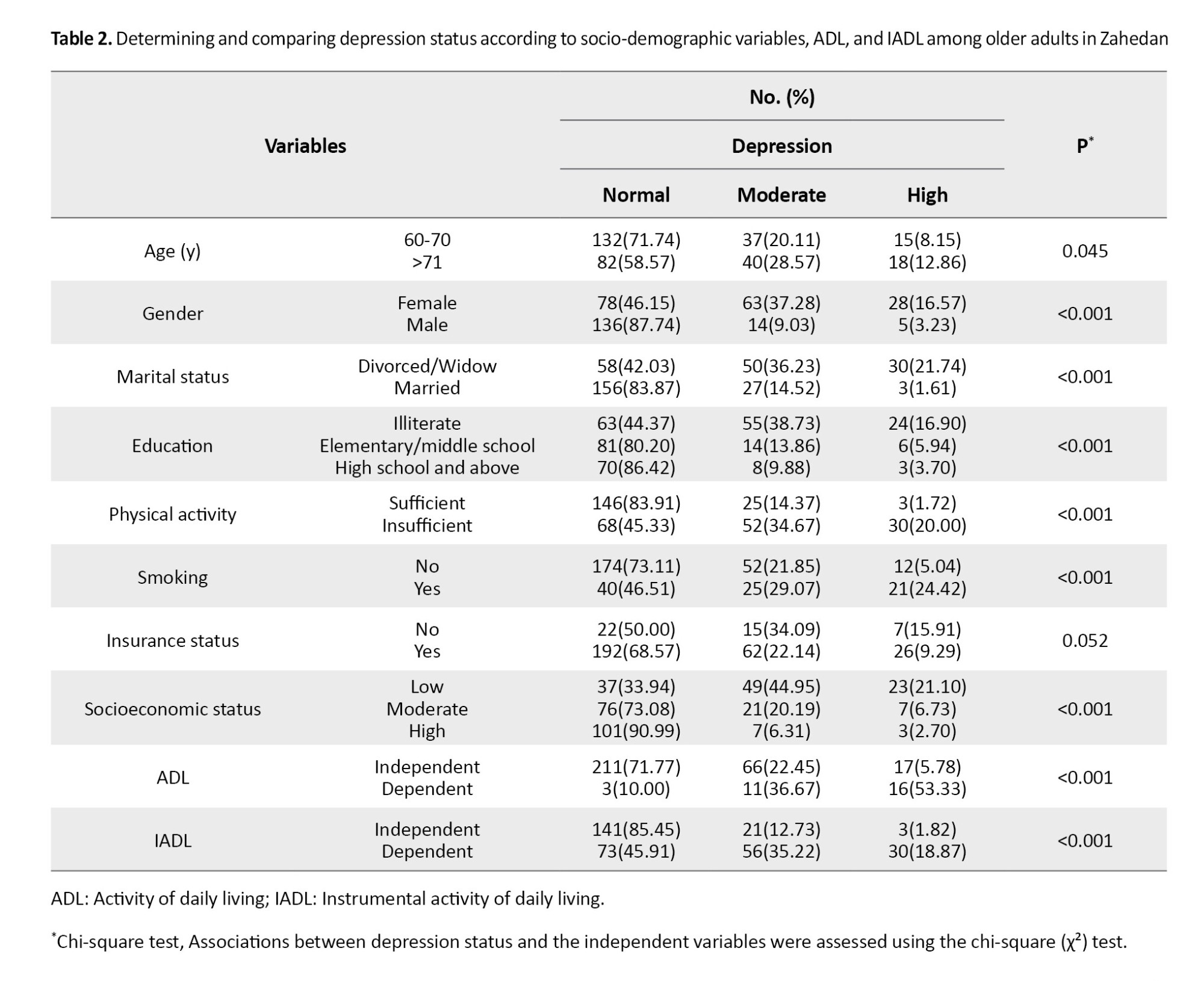 While previous studies have addressed different aspects of elderly well-being, there is a significant research gap in comprehensively examining depression and its multifaceted relationship with ADL and IADL, particularly among the elderly in Zahedan. Existing research may be limited due to its geographical scope, focus on only one type of activity (ADL or IADL), or failure to fully consider the unique demographic and socioeconomic factors prevalent in this particular region. Therefore, this study aimed to determine the relationship between depression and ADL and IADL among older adults in Zahedan in 2024. The innovation of this research lies in its comprehensive approach to examining these associated factors in a previously understudied population, thereby providing essential data for targeted health interventions and policies in the region. Specifically, this study sought to answer the following research questions: 1) What is the prevalence of depression among older adults in Zahedan? 2) Is there a significant relationship between depression and ADL among older adults in Zahedan? 3) Is there a significant relationship between depression and IADL among older adults in Zahedan? 4) Is there a significant relationship between depression and socio-demographic among older adults in Zahedan?