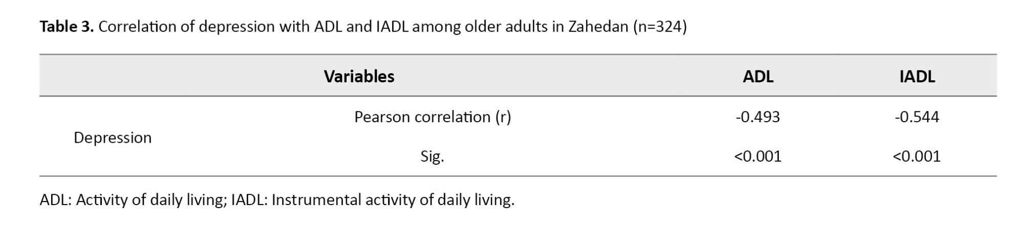 The normality of the data was confirmed using the Shapiro–Wilk test, and to examine the relationship between depression, ADL, and IADL, the Pearson correlation coefficient was used. There was a significant negative relationship between depression and ADL (r=-0.493, P<0.001), and between depression and IADL (r=-0.544, P<0.001) among older adults. This indicates that higher levels of depression are associated with greater limitations in both ADL, IADL. The Pearson correlation coefficients (r) represent the effect sizes for these associations, suggesting a moderate-to-strong relationship in both cases (Table 3).