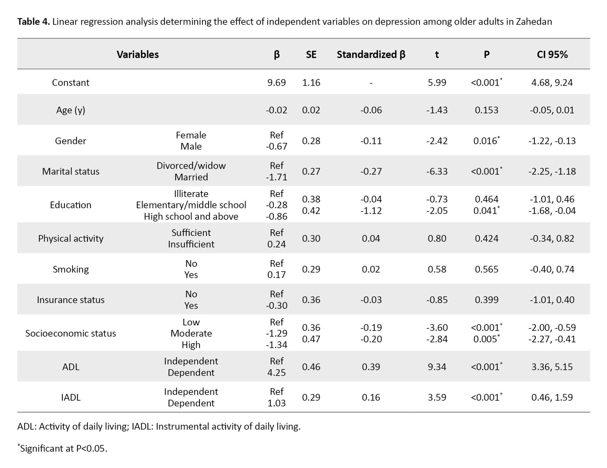To determine the predictor variables of depression, a linear regression model was utilized, with depression as the response variable and other relevant variables as predictors. Prior to the analysis, all critical assumptions for linear regression were thoroughly assessed: the dependent variable (depression score) exhibited a normal distribution as confirmed by the Shapiro-Wilk test, residuals also followed a normal distribution with a mean of zero and constant variance, their independence was verified, and multicollinearity among independent variables was assessed using variance inflation factor (VIF). The mean VIF was calculated to be 1.81, which is well below typical thresholds, suggesting no significant multicollinearity issues. Upon confirmation of these assumptions, the overall regression model was found to be statistically significant (F=38.17, P<0.001). However, gender, marital status, education, socioeconomic status, ADL, and IADL remained in the model as predictors of individual depression. This study showed that, with other variables held constant, the depression score in men was on average 0.67 points lower than that of women (β=-0.67, t=-2.42, P=0.016), and the depression score in married people was on average 1.71 points lower than that of widows/divorced older adults (β= -1.71, t=-6.33, P<0.001). The depression score in participants with a high level of education was, on average, 0.86 points lower than that of illiterate older adults (β= -0.86, t=-2.05, P=0.041). Similarly, the depression scores in participants with high and moderate socioeconomic status were, on average, 1.34 points and 1.29 points lower than those of participants with low socioeconomic status, respectively.