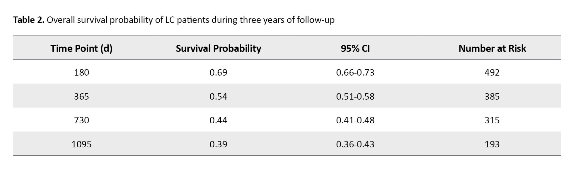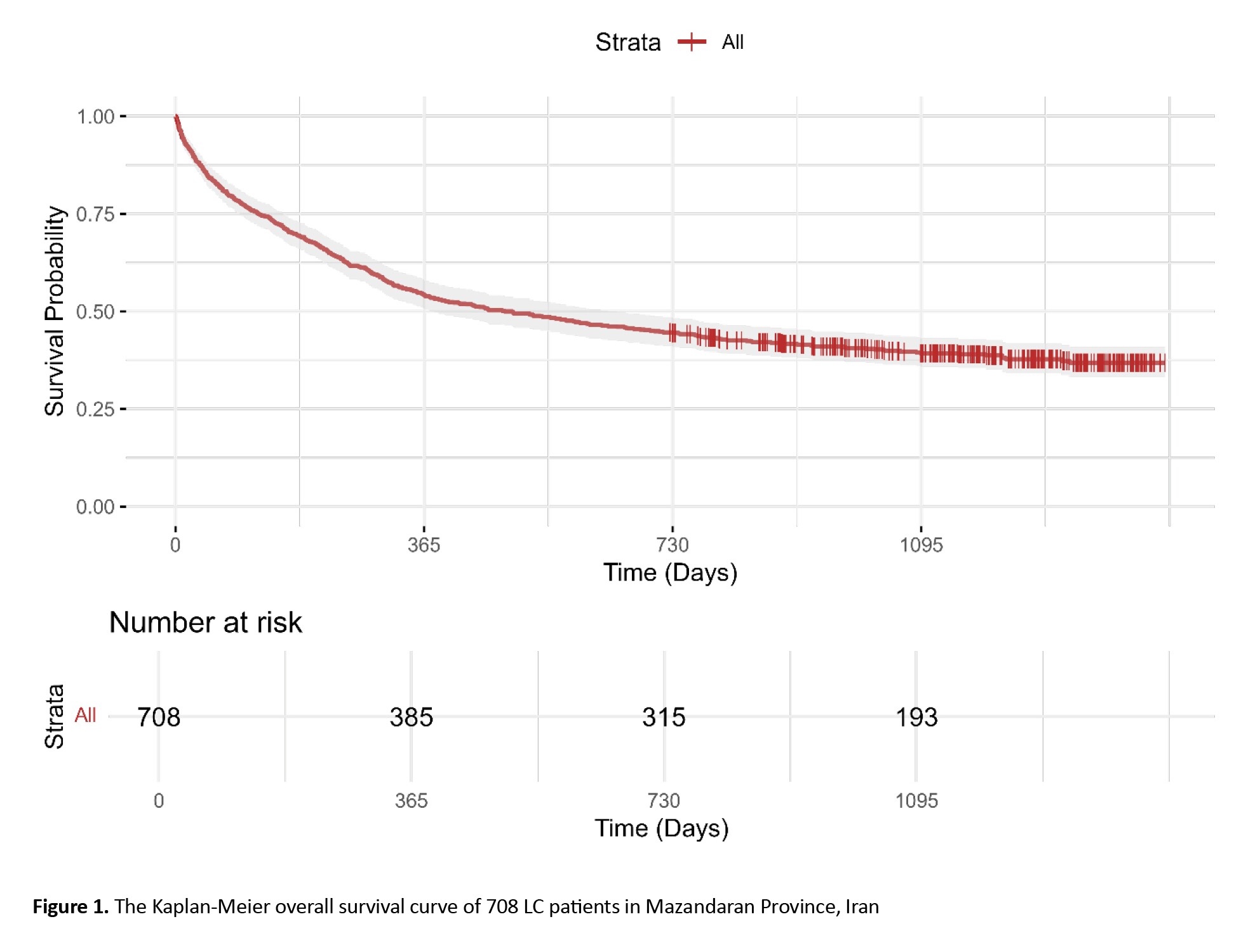 In the present study, 6-month, 1-year, 2-year, and 3-year survival rates of 708 LC patients were 69%, 54%, 44%, and 39%, respectively. Other studies were conducted in various provinces of Iran, with considerable variability in survival rates. In a study by Bahari et al. [31] on 73 Kurdish Iranian LC patients, the 1-, 2-, and more than 2-year survival rates were 27%, 22%, and 16%, respectively. In a study by Abedi et al. [18] in Sari on 102 LC patients, 1-, 2-, and 3-year survival rates were 57%, 34%, and 29%, respectively. Babanejhad et al. [20] assessed 259 LC patients in Tehran (capital city of Iran) and estimated the 1-, 2-, and 3-year survival to be 63%, 53%, and 46%, respectively. Abazari et al. [9] studied 355 LC patients in Western Azerbaijan and found the 1-, 2-, and 3-year survival rates to be 39%, 18%, and 0.07% respectively, in this population. Another study by Zahir et al. [19] on 148 LC patients in Yazd found that only 25% of patients live longer than 1 year after diagnosis.