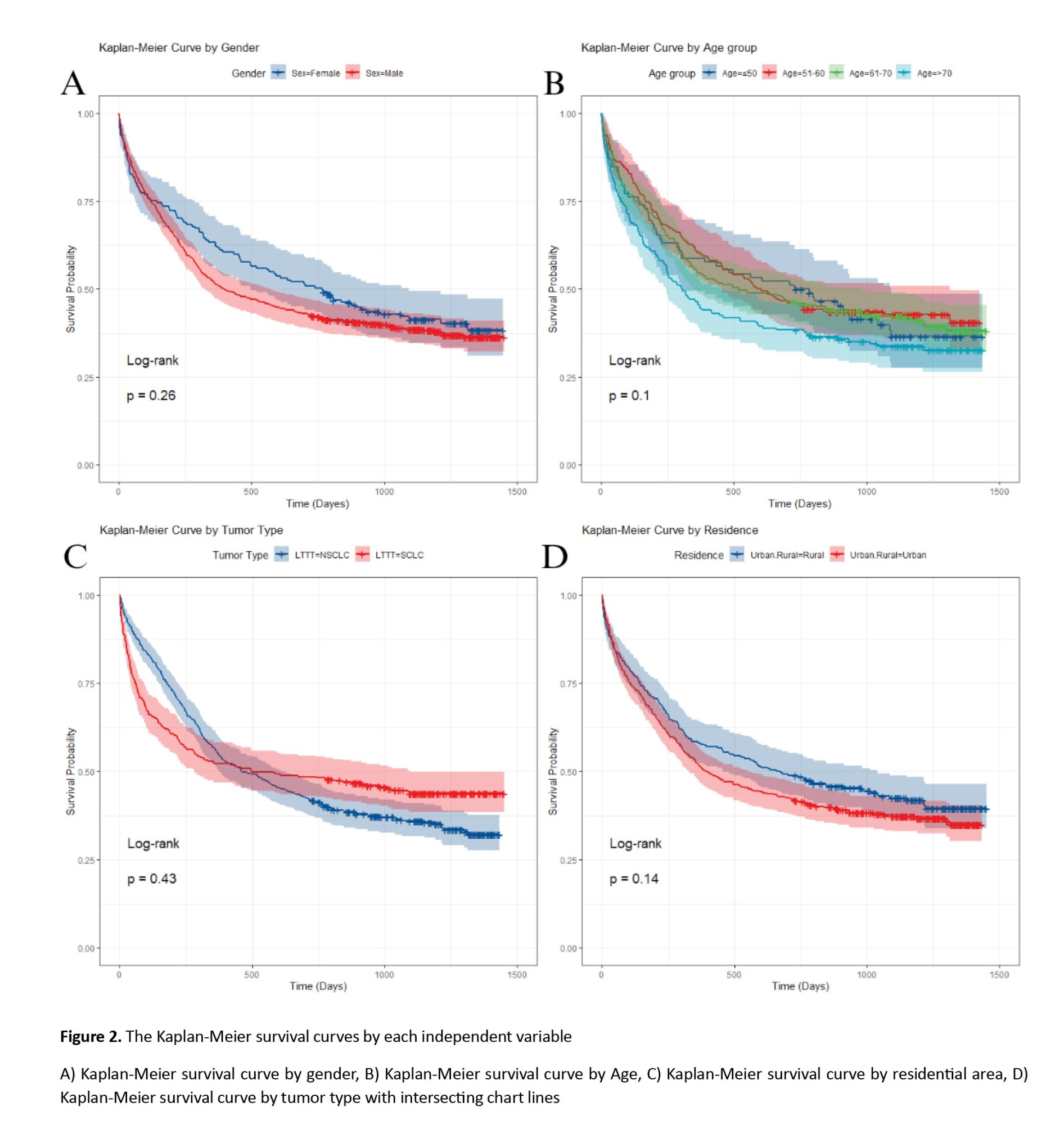 Our analysis indicated no significant difference in survival among males and females, or patients living in urban versus rural areas. Also, none of the age groups showed a significant association with survival outcomes (All P>0.05) (Figure 2).