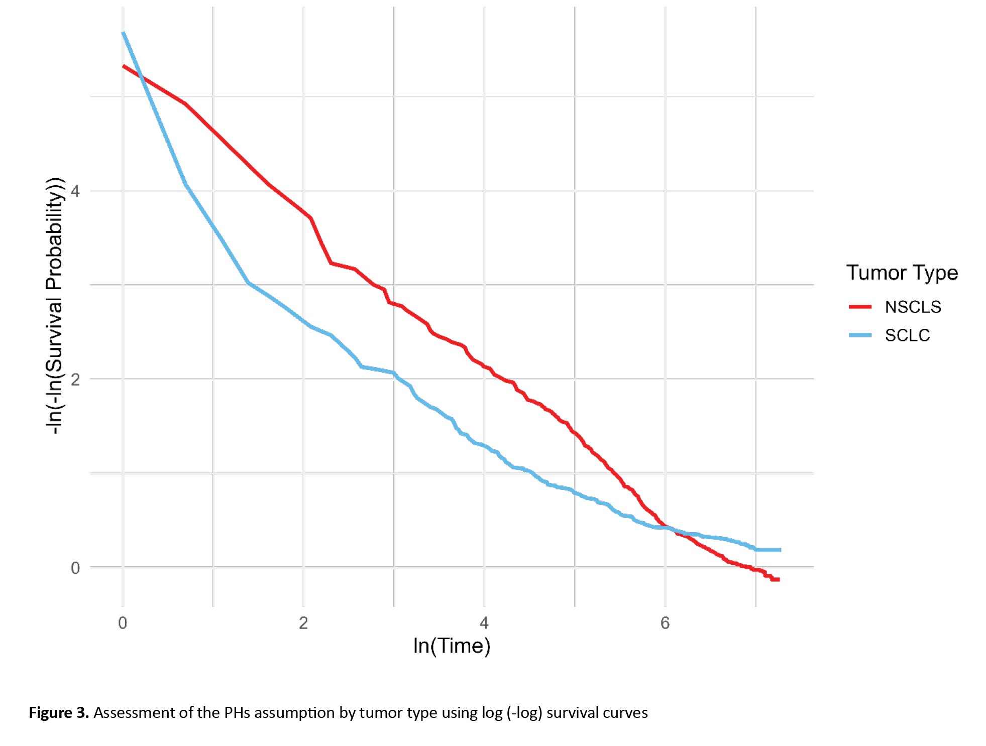 In contrast, tumor type emerged as a strong and statistically significant predictor of mortality. Patients diagnosed with small-cell LC exhibited a substantially higher risk of death compared to those with non-small-cell LC (HR=1.69; 95% CI, 1.28%, 2.23%; P<0.001). However, inspection of the log-minus-log survival curves (Figure 3) revealed clear non-parallelism between groups, indicating a violation of the PHs assumption for this variable. To account for this temporal non-proportionality, a time-varying Cox model was applied by incorporating an interaction term between tumor type and time. This model revealed a statistically significant interaction effect, with a hazard ratio of 0.998 (95% CI, 0.997%, 0.998%; P<0.001), suggesting a modest but consistent decline in the relative mortality risk associated with small cell LC as time progressed. Clinically, this trend aligns with the known biological behavior of small cell LC, an aggressive malignancy with high early mortality, followed by a reduction in risk among long-term survivors. In contrast, non-small cell LC typically demonstrates a more stable risk profile over time. Overall, incorporating time-dependent Effects into the multivariate Cox regression enhanced the temporal resolution of risk estimation and emphasized the necessity of flexible modeling approaches in survival analyses, particularly when dealing with rapidly evolving diseases such as small cell LC.