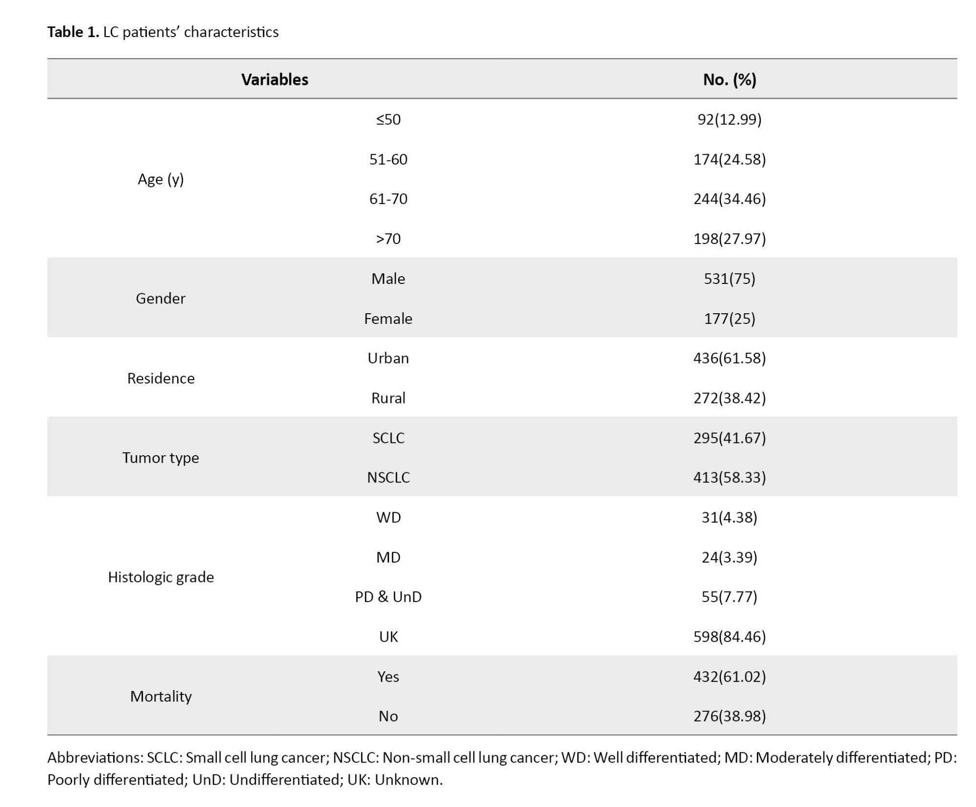 Out of 708 LC patients, 431 (61.02%) died during the follow-up period. Patients included in this study were those whose diagnoses had been registered in the Cancer Registry of MAZUMS between 2017 and 2019 (corresponding to 1396–1398 in the Iranian calendar). These patients were then followed up until February 2023. Thus, the maximum potential follow-up duration was nearly 6 years. Follow-up time varied across individuals, with a median follow-up of 489 days (the interquartile range [IQR]: 121.5-1118.75). The mean age of LC patients was 64±12.42 years. Regarding histologic grading, 31(4.38%), 24(3.39%), and 53(7.49%) patients had well-differentiated, moderately differentiated, and poorly differentiated tumors, respectively. The majority of the LC tumors were non-small cell LC (58.33%) (Table 1).