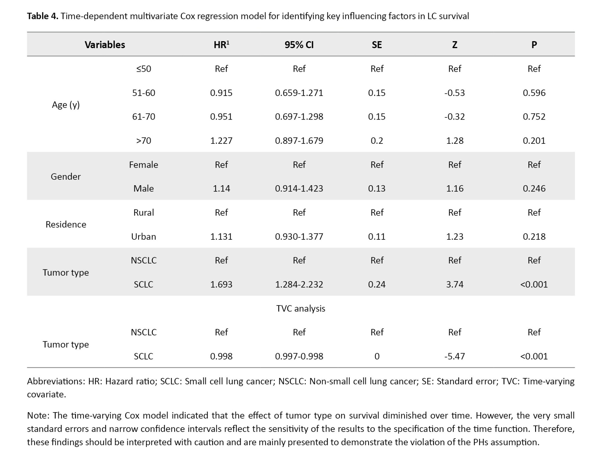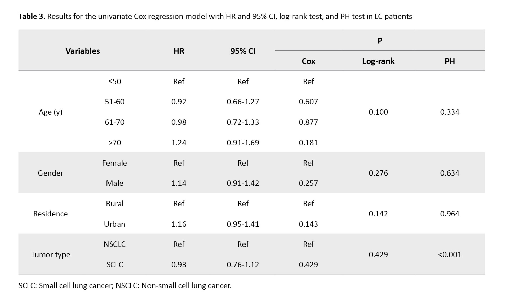 In LC patients with small cell LC, the HR was 0.93 (95% CI, 0.76%, 1.12%), with a univariate Cox regression P-value of 0.432 and a log-rank test P of 0.429, indicating no significant difference in survival between SCLC and NSCLC patients. However, the P for the PH test was 0.0009, suggesting a significant difference from the perspective of the PH model. Also, as shown in Figure 2, the chart line of both tumor type subgroups (small cell LC and non-small cell LC) intersects. These results reveal that the PH assumption was violated for tumor type (P<0.001). The PH assumption was evaluated using both Schoenfeld residuals and log-minus-log survival plots. As illustrated in Figure 3 of the manuscript, the log-minus-log survival curves for tumor type were not parallel. In addition, the Schoenfeld residuals test indicated a significant violation for tumor type (P<0.001) in Table 3. No other variables showed a violation of the PH assumption. Given this violation and the lack of significant associations across all variables, the use of a multivariate Cox regression model with time-varying covariates (for tumor type, which may change over time) could be expected to provide more accurate results.