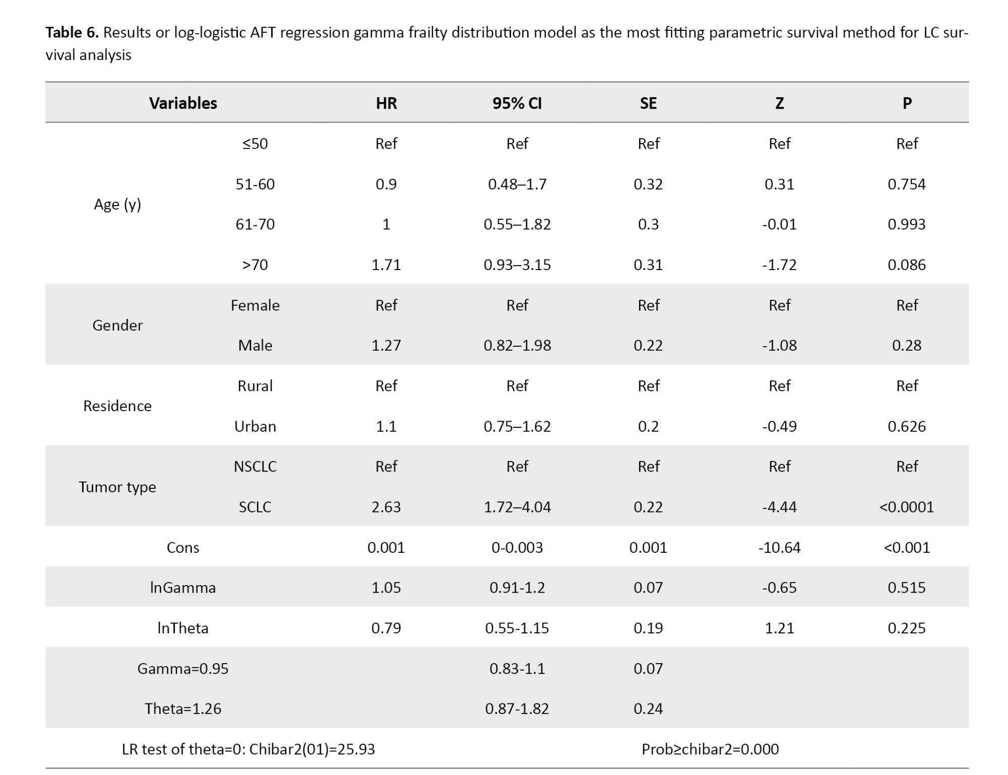 Table 6 summarizes the estimated hazard ratios and corresponding statistics from the log-logistic AFT model with gamma frailty. The overall model was statistically significant, with a likelihood ratio chi-square of 28.21 (P<0.001). No significant associations with survival were detected for gender (HR=1.27; 95% CI, 0.82%, 1.98%, P=0.280), residence (HR=1.1; 95% CI, 0.75%, 1.62%, P=0.626), or age groups 51–60 (HR=0.9; 95% CI, 0.48%, 1.7%, P=0.754) and 61–70 (HR=1; 95% CI, 0.55%, 1.82%; P=0.993). However, individuals aged over 70 years exhibited a higher risk of death, approaching statistical significance (HR=1.71; 95% CI, 0.93%, 3.15%; P=0.086). Tumor histology emerged as a strong and statistically significant predictor of survival. Patients with small-cell LC had a markedly higher risk of death compared to those with non-small-cell lung cancer, with a hazard ratio of 2.63 (95% CI, 1.72%, 4.04%; P<0.0001). The frailty component of the model was also statistically significant, as indicated by the likelihood ratio test of θ=1.26 (95% CI, 0.87%, 1.82%; P<0.001), confirming the presence of substantial unobserved heterogeneity in survival risk. This finding underscores the importance of accounting for latent individual-level variability when modeling survival outcomes in LC populations.