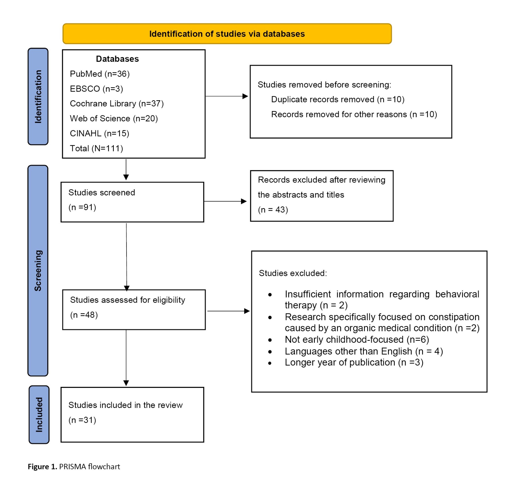 A comprehensive literature search was conducted in PubMed, Web of Science (WoS), CINAHL, EBSCO, and Cochrane CENTRAL. These databases were selected because they index a broad range of high-quality studies in pediatrics, gastroenterology, clinical, nursing, and behavioral research literature. The search was limited to studies published from 2014 to June 2025 to ensure it included studies that incorporated updated diagnostic criteria (such as Rome IV), evolving treatment recommendations, and clinical practices in managing pediatric constipation. The keywords used in describing constipation were “pediatric constipation” OR “childhood FC”. The study participants were identified using the keywords “infant” OR “child” OR “toddlers” OR “preschoolers”. The keywords used in searching for treatment approaches were “pharmacological therapy” OR “laxatives” OR “drug therapy” AND “non-pharmacological therapy” OR “behavioral therapy”.
