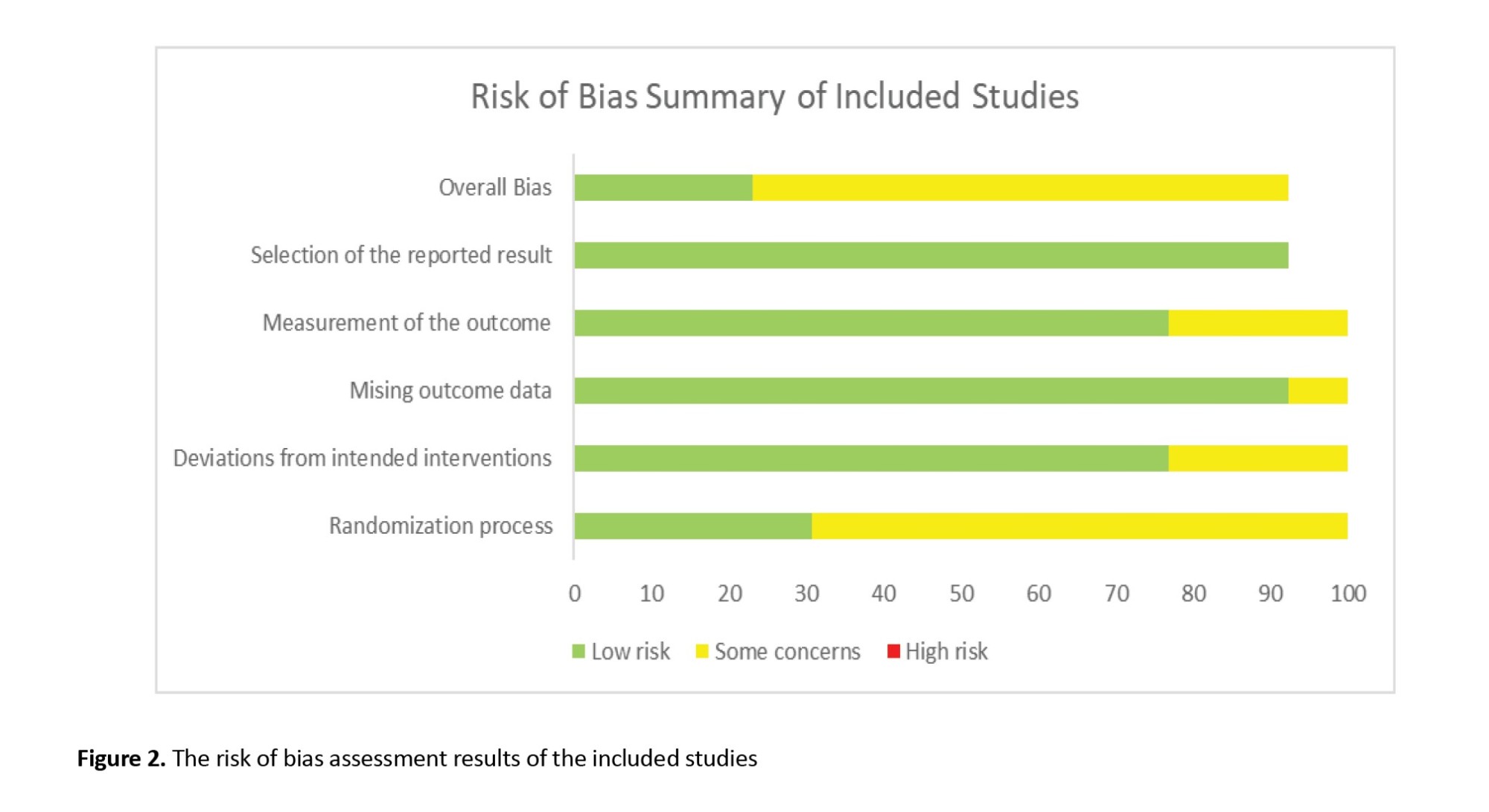 The risk of bias assessment was conducted only in 13 studies that specifically focused on children aged 0-5 years, using the Cochrane risk-of-bias tool. A visual summary of the risk of bias assessment is provided in Figure 2. Although most studies had low risk of bias in several domains, there were some concerns regarding overall bias and in the randomization process, deviations from intended interventions, and the measurement of outcomes.