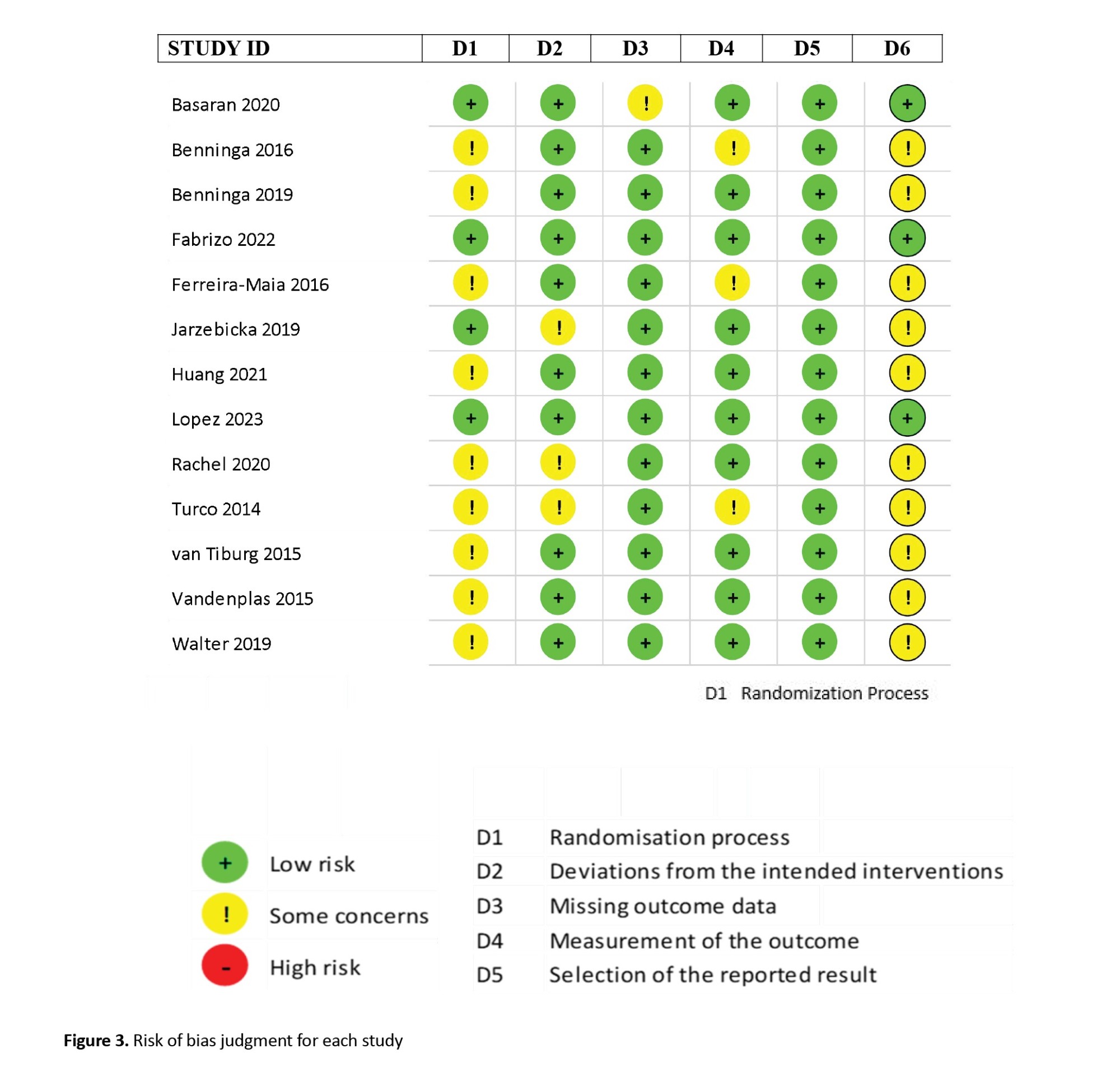 In three studies [17-19], the risk of bias was low across all domains, suggesting that these studies were conducted well. In the remaining studies, a low risk of bias was observed in most domains. However, there were some moderate concerns regarding the process due to unclear intentions regarding the process, and the deviation from the intended interventions was reported in one study [15], which may have affected the outcome.
