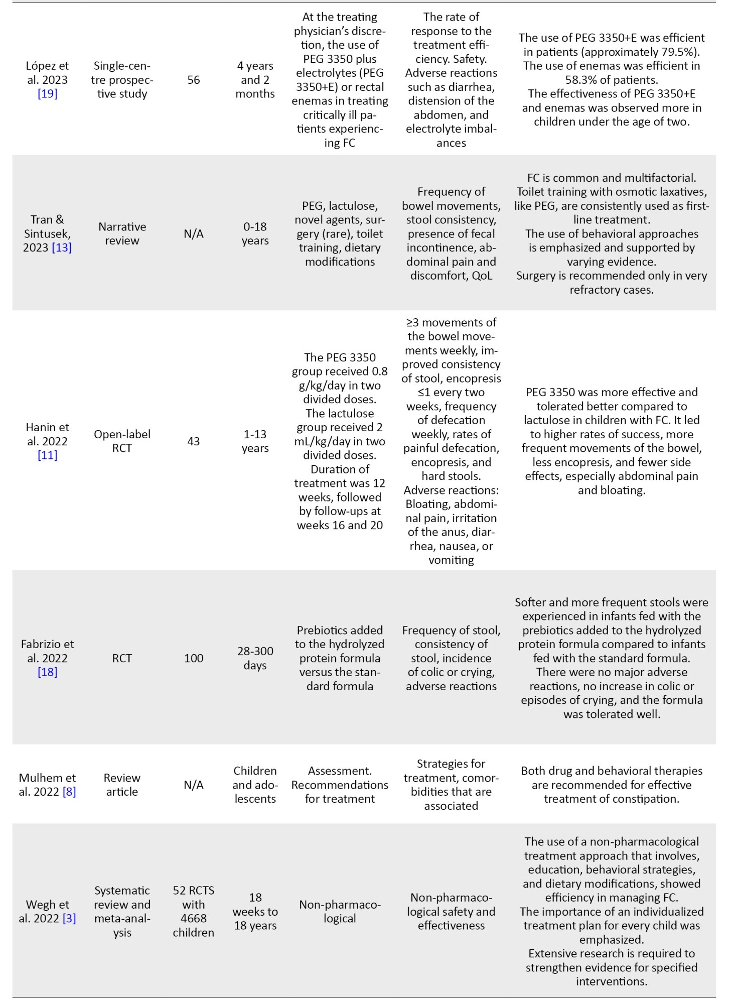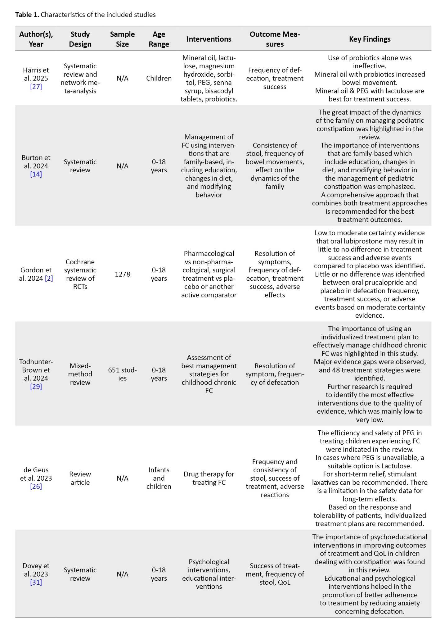 The characteristics (author name, year of study, study design, sample size, age of participants, interventions, outcomes, and key findings) of the included articles were extracted (Table 1). In synthesizing the data, differences in treatment effectiveness were explored based on specific factors such as participants’ age, severity of constipation, treatment duration, and the type of intervention (drug treatment and behavioral therapy).