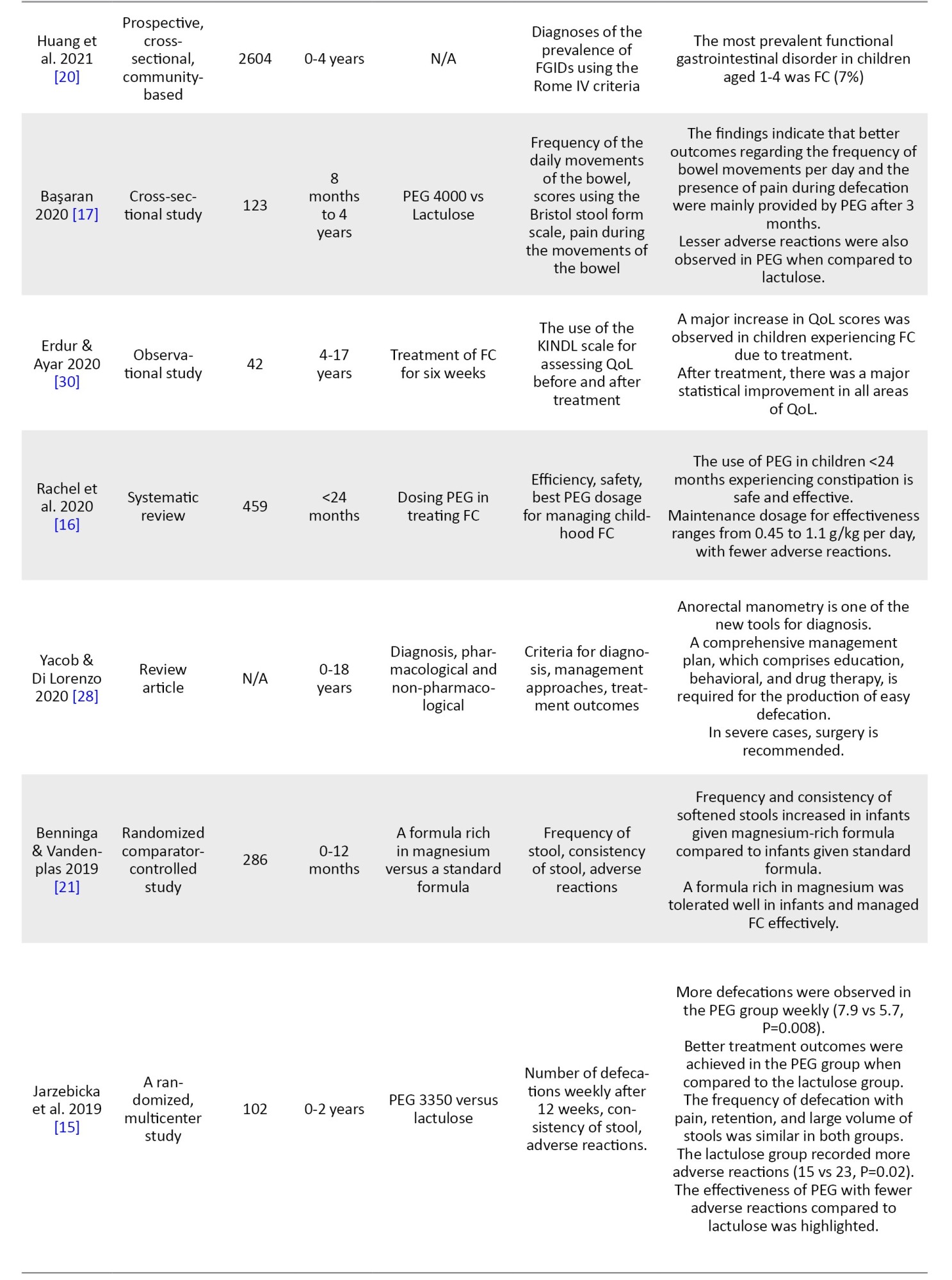 The review of studies showed the variability in treatment outcomes based on factors such as age, severity of constipation, and duration of treatment. The variation in response to treatment among age groups indicates the importance of developmental stage, in addition to chronological age. Individualized treatment strategies should consider factors such as the child’s motor skills, communication skills, emotional management, and independence level. These personalized approaches ensure that interventions are suitable for developmental stages and applicable practically, improving adherence to treatment, therapeutic outcomes, and overall QoL. A randomized, multicenter study conducted by Jarzebicka et al. [15] demonstrated the superior effectiveness of PEG across varying severities of FC, supporting its role as a fundamental component in treatment guidelines. However, the 12-week follow-up duration of the study might be insufficient to thoroughly evaluate outcomes in severe or chronic situations, where alleviating symptoms and adjusting behavior can take several months of consistent intervention.