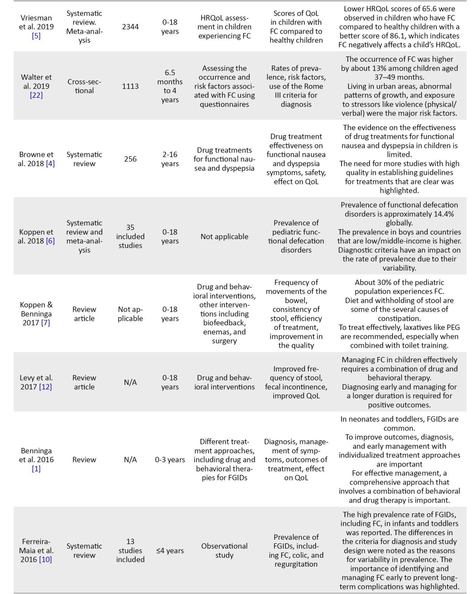 We included various study designs, particularly RCTs. The selection process followed the population, intervention, comparison, and outcome (PICO) framework. The population included children aged 0-5 diagnosed with FC according to the Rome IV criteria. The study interventions included drug treatments (e.g. PEG, Lactulose), compared with behavioral therapies, such as toilet training, changes in diet, structured programs for behavior, and positive encouragement. The study outcomes included frequency of bowel movements, consistency of stool, occurrence of fecal incontinence, and HRQoL. The exclusion criteria were specifically focusing on constipation caused by organic medical conditions like Hirschsprung’s disease or spina bifida or by preexisting conditions, publishing in a non-English language, not focusing on children within the defined age group, and publishing >10 years ago.