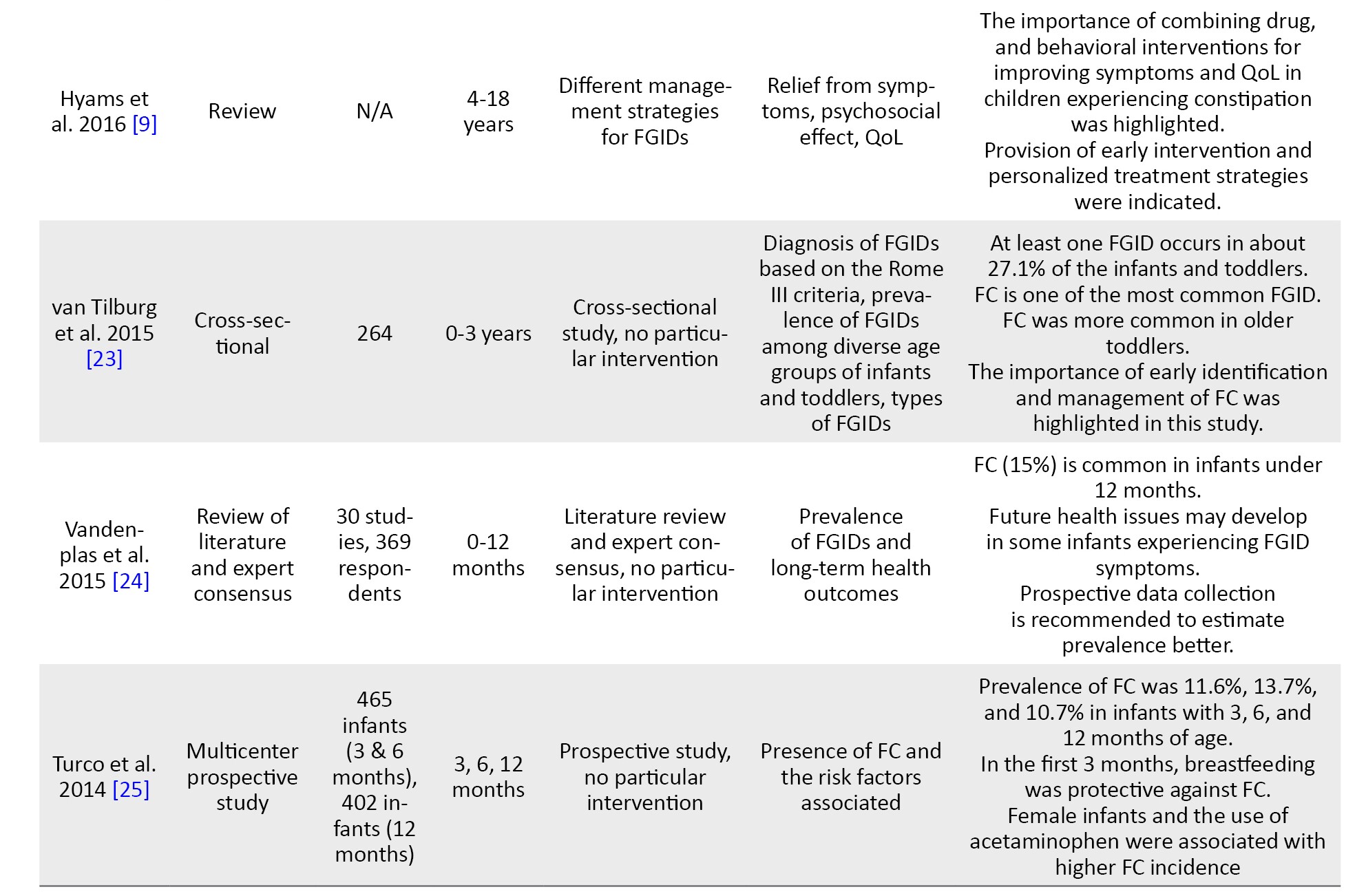 According to a systematic review of functional gastrointestinal disorders (FGIDs) in infants and toddlers, based on the Rome III criteria, the prevalence of FC at 3 months of age was 11.6% [10]. Findings of a study showed that the prevalence of FC in China was approximately 3% in infants (0-12 months) and 7% in children aged 1-4 years which indicates that FC is a major public health concern [20]. A cohort study conducted in Italy reported the prevalence of FC in infants with 3, 6, and 12 months of age as 11.6%, 13.7%, and 10.7%, respectively [23]. In a recent study conducted in the United States, approximately 4.7% of infants and 9.4% of toddlers were experiencing FC [23]. The prevalence of FC in children is influenced by different factors, including age, diet, and psychology [10]. Huang et al. [20] reported that in the child with vaginal birth, the risk of experiencing FC was significantly lower (OR=0.005, 95% CI, <0.001%, 0.17%, P=0.003) [21]. In another cross-sectional study, FC was seen in 8% of underweight infants and toddlers [22]. Regarding the geographic area, a study in China showed that the rate of FC in rural areas was higher (4.6%) than in urban areas (2.9%) [20]. In Asia, a lower prevalence of FC was observed. Walter et al. reported that according to the Rome IV criteria, the prevalence of FC in Asia was approximately 0.5-29.6%, with a pooled estimate of about 6.2% [22].